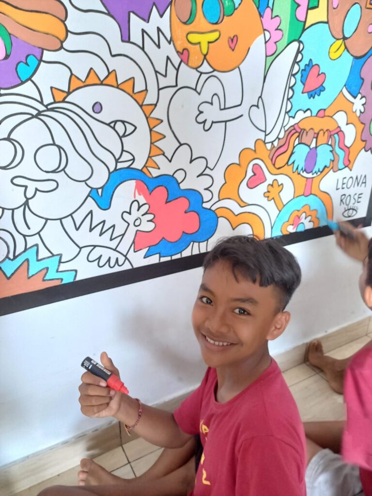 Pour clôturer ce mois de juillet et pendant trois jours, les enfants ont reçu la visite d’une jeune artiste française solidaire : Léona Rose. Diplômée de l’école des Beaux Arts de Paris, Léona s’inspire de ses voyages pour créer des fresques murales participatives aux couleurs vives et solaires. Léona a réalisé plusieurs fresques murales à Tejakula et à Singaraja, au pensionnat